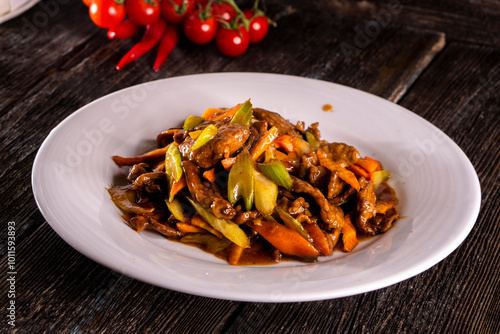 Chinese vegetables with beans on a wooden background. Food concept. Chinese food.