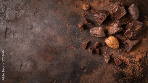 chocolate and walnut a delicious pairing, dark chocolate pieces on dark background, dark chocolate pieces artfully displayed, chocolate chunks with walnuts, dark chocolate and walnut a perfect combin