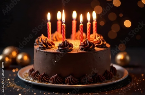 chocolate cake with lit candles against sparkling bokeh background. birthday or celebration concept. party invitation, festive decoration, greeting card.