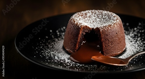 Chocolate lava cake dusted with powdered sugar rests on a black plate with molten center oozing onto the surface next to a spoon.