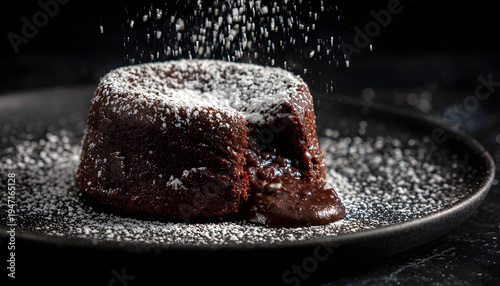 Chocolate lava cake with a gooey molten center, dusted with powdered sugar on a dark plate. Concept Molten chocolate lava cake, Gooey center, Powdered sugar dusting