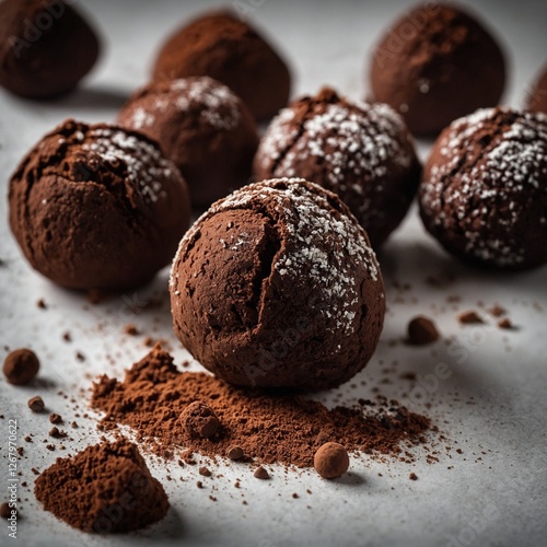 Chocolate truffles with cocoa dusting on plate A plate of chocolate truffles dusted with cocoa powder, inviting and decadent.A close-up of chocolate truffles dusted with cocoa powder, showcasing a