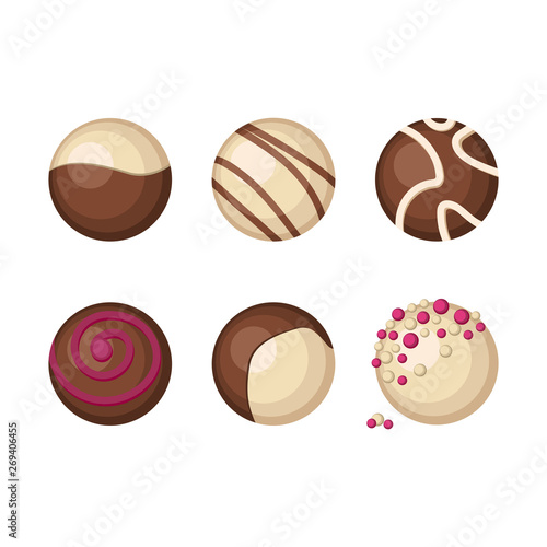 Chocolates candies with various decorations and sprinkles. Isolated elements on white background. Brown color.