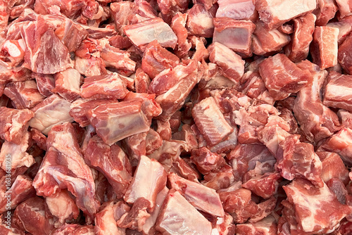 Chopped raw pork ribs with bone and fat, piled up for sale at a meat counter.