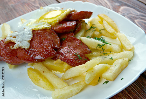 chilean, dish, food, chips, french fries, sausage, plate, fat, unhealthy, fats, yellow, egg, breakfast, orange, crunchy, tasty, taste, lunch, french, fries, potato
