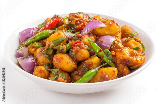 Chotpoti offers a spicy blend of chickpeas, potatoes, tamarind sauce, and chilies, making it a must-try street food from Bangladesh, presented beautifully on a white background