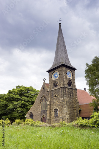church, england, stone, church steeple, sky, window, architecture, nobody, roof, tile, clock, masonry, tower, weather vane, storm, tree, grass, green