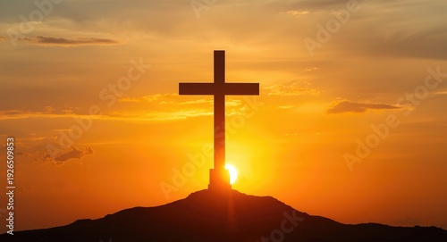 Christian cross rising before a glowing sunset creating a powerful image with copy space for religious inspiration