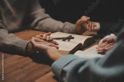 Christian group are praying to god with the bible and sharing the gospel. Concept of faith for god.
