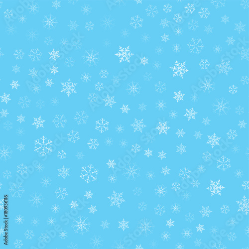 Christmas abstract background from white snowflakes on blue. Seamless pattern for design cards, posters, greeting for the new year.