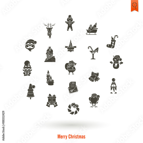 christmas, holiday, vector, gift, winter, decoration, christmas, icon, symbol, celebration, illustration, set, design, year, new, season, signs, december, merry, flat, collection, happy, greeting, card, santa, santa, claus, cervid, reindeer, candy, ribbon, object, gingerbread, tree, bag, sleigh, sack, sock, ball, snow, snowman, chaplet, holly, mitten, bell, candle, isolated