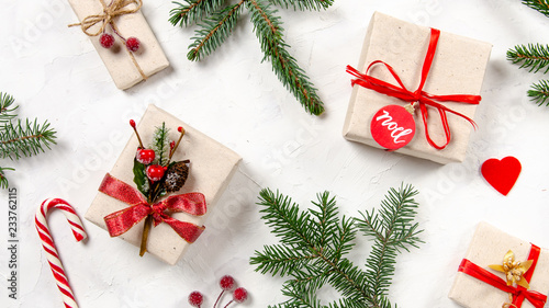 Christmas background with homemade wrapped in craft paper christmas presents, candy cane and fir branches on wooden surface. Top view