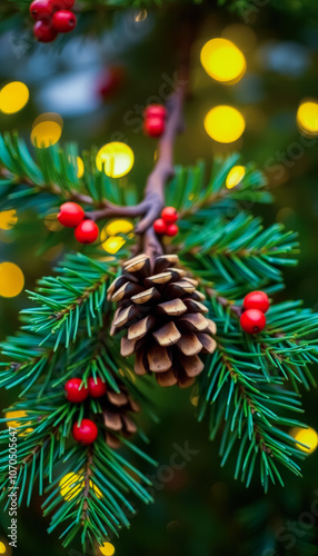 pine, tree branch, pine cone, berry, closeup, glowing, light, festive, warm, holiday, winter, christmas, decoration, green, needle, brown, soft, yellow, vibrant, detailed, background, tree, nature, season, celebration, cosy, decorative, traditional, ornamental, bright, cheerful, joyful