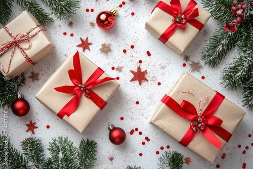 Christmas fir branches, gift boxes with red ribbon, red decoration, sparkles and confetti on white background. Xmas and New Year greeting card, winter holiday. with generative ai