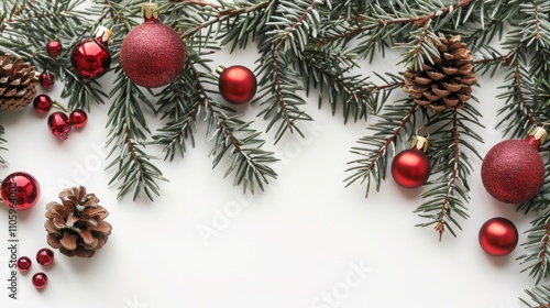 Christmas flat lay mockup frame fir branches with red toys and pine cones on white background