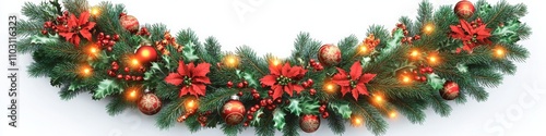 Christmas garland adorned with red poinsettias, glowing lights, and festive ornaments, ideal for seasonal decorations, holiday designs, and Christmas themes