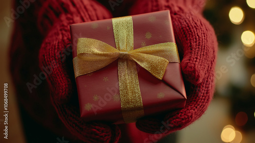 christmas gift box, red gift box, a gloved hand holding a Christmas gift, christmas gift box, person with christmas presents, hands holding christmas gift