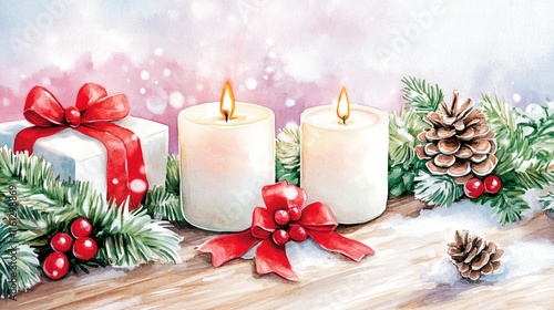 Christmas gifts reunion concept. Festive scene with candles, pinecones, and holiday decorations on a wooden surface.