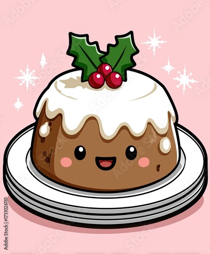 christmas, pudding, christmas, dessert, food, sweet, vector, delicious, illustration, plate, celebration, holiday, holly, berry, smile, cartoon, cute, fun