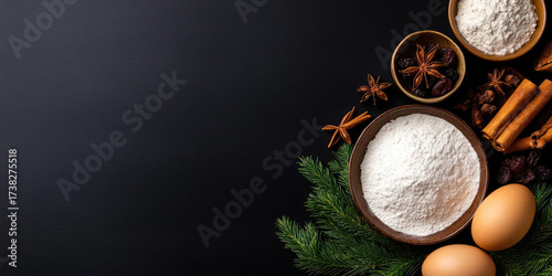 christmas, pudding, baking, 2026, ingredient, food, holiday, festive, dessert, spice, cinnamon, star, anise, egg, flour, dried, fruit, dark, background, cooking, prepare, celebration, traditional, winter, delicious, homemade, sweet, receipe, new, year, table, overhead, flat, lay, directly, no, people, raw, organic, fresh, natural, healthy, epicure, rustic, wood, spoon, pine, cone, tree branch