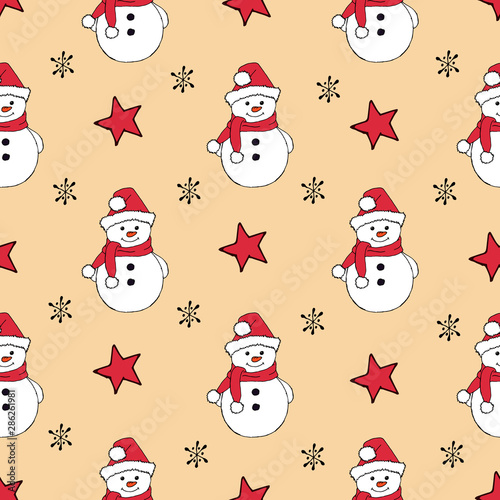 Christmas seamless pattern with snowman, fir trees and snowflakes. Perfect for wallpaper, wrapping paper, pattern fills, winter greetings, web page background