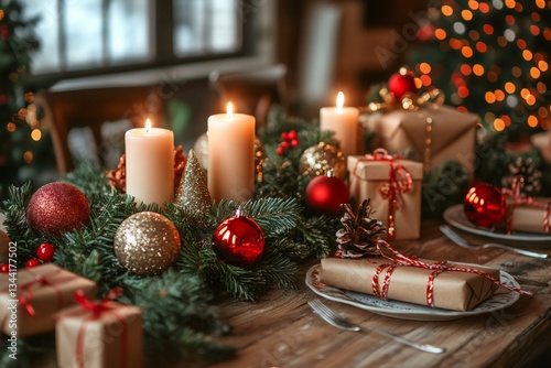 christmas, table, setting, decoration, candle, gift, present, bauble, fir, tree branch, centrepiece, festive, holiday, celebration, winter, cosy, home, family, dinner, party, tradition, rustic, wood, light, warmth, red, gold, green, bokeh, christmas tree, eve, new year, seasonal, december, christmas, ornament, magic, joy, togetherness