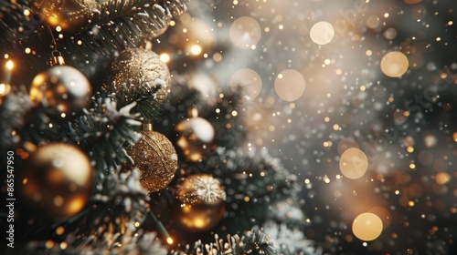 Christmas tree adorned with sparkling gold tinny ornaments Festive winter scene