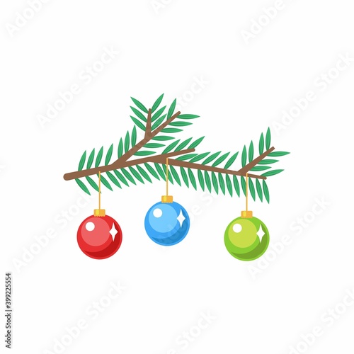 Christmas tree branch with decorative balls vector illustration, isolated on white background
