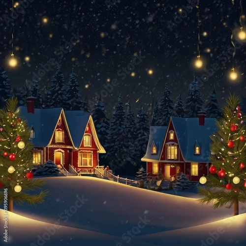 christmas, winter, tree, snow, christmas, holiday, illustration, landscape, house, decoration, vector, christmas tree, season, celebration, card, snowflake, night, greeting, fir, scene, cold, new year, star, year, village