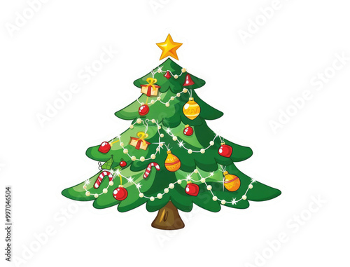 Christmas tree with different decorations and gifts isolated on transparent background. Winter Holidays concept with balls, lights, icicle decor in cartoon style