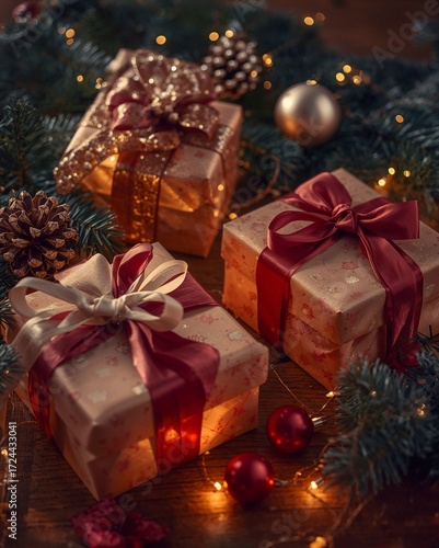 christmas, gift, decoration, holiday, box, christmas, celebration, present, ball, tree, ornament, gold, ribbon, gold, year, bow, bauble, new, object, winter, gift, season, red, decor, celebrate