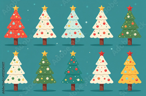 Christmas trees decorated with balls stand on blue background, New Year card with snowflakes