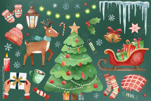 watercolor, winterly, christmas, cartoon, cosy, reindeer, clip art, merry christmas, children, christmas, fairy, holiday, christmas tree, festive, gift, sleigh, present, hat, mitten, foulard, lantern, christmas, light, garland, star, snowflake, icicle, bell, candle, blanket, sock, pine, ornament, celebration, new year, magic, warm, candy, christmas tree, illustration, tradition, hand-drawn, christmas card, set, new year, collection, december, seasonal, knit up