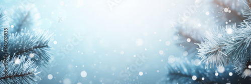 Christmas winter snow background with fir branches macro with soft focus and snowfall in blue tones with beautiful bokeh in sunny day, copy space, banner format