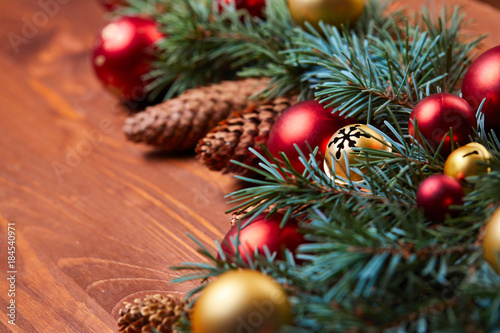 fir, tree, wood, wooden, christmas, nature, winter, new year, concept, style, decor, tree branch, cone, christmas tree, celebration, calendar, card, space, table, board, design, frame, needle, ball, red, present, ribbon, candle, chaplet, gold