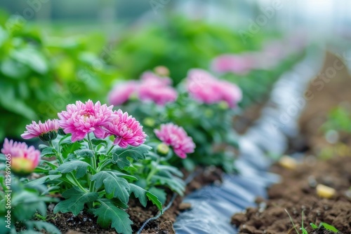 Chrysanthemum seedlings planted in rows with drip irrigation and weed barrier fabric