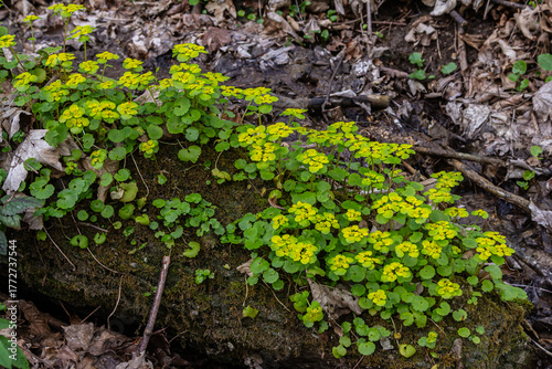 Chrysosplenium alternifolium growing vibrantly on a shaded log near a stream in springtime