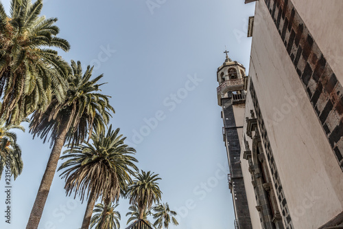 church, canary, tenerife, island, la, palm, spain, palm, tree, building, europa, background, travel, nobody, architecture, red, view, city, religion, landmark, street, tower, city landscape, cruz, nature, blue, dome, conception, immaculate, summer, sky, old, style, colourful, landscape, outdoors, sea, traditional, sun