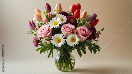 Cinematic Photo of a Vibrant Mixed Garden Flower Bouquet with Roses, Daisies, and Tulips in a Clear Glass Vase on a Light Beige Background, Captured with Soft Light and Shallow Depth from an Overhead