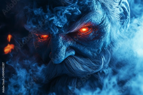 Cinematic style, a large mustachioed monster made of smoke with glowing red eyes rising from its face. blue lighting, dark atmosphere,