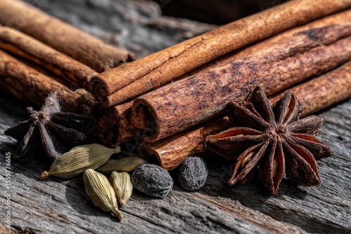 Cinnamon sticks, star anise, and other spices on weathered wood