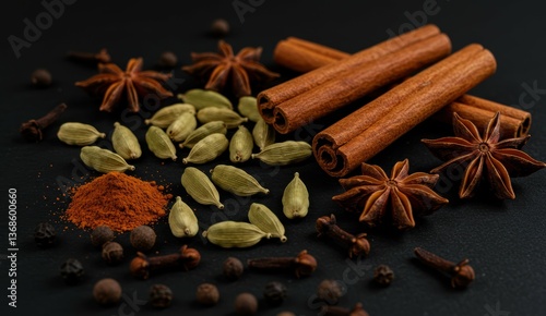 Cinnamon sticks, star anise, green cardamom, and cloves arranged artistically on black background. Concepts of culinary arts.