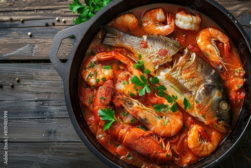 Cioppino Seafood Stew. A Delicious Combination of Fish, Prawns, and Shrimp in a Modern Cast-Iron