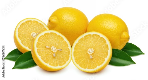 Citrus Burst: A vibrant composition of fresh lemons, some whole and others sliced, showcases their bright yellow skin, juicy flesh, and the subtle beauty of green leaves.