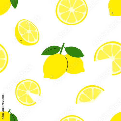 Citrus fruit. Lemon branch with green leaves. Lemon whole and cut, half and slices. Vector seamless pattern with lemons isolated on white. Endless texture, positive print in flat cartoon style.