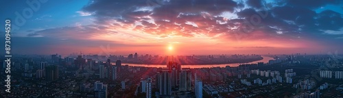 City Awakening with Sunrise, The city slowly waking up with the sunrise, symbolizing the start of business activities and growth