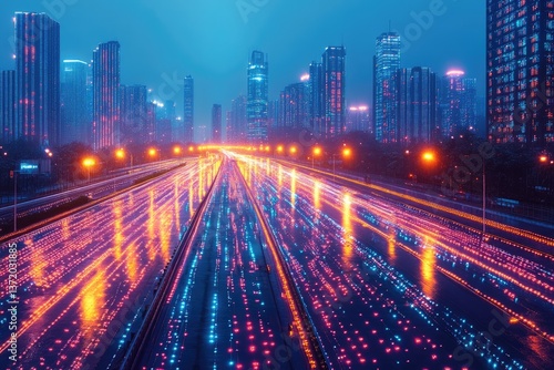 city landscape, urban, highway, light, night, modern, architecture, traffic, street, skyline, blurred, motion, long, exposure, futuristic, glow, building, road, transportation, car, speed, evening, dark, vibrant, neon, wet, abstract, perspective, downtown, illumination, technology, travel, destination, journey, rush, drive, metropolis, infrastructure, structure, construction, urbanity, environment, vehicle, commute, business, lifestyle