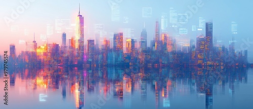 digital, twin, technology, city, skyline, building, holographic, real, time, urban, virtual, monitoring, datum, connection, architecture, canvas, realism, tablet, painting, panorama, wide, banner, title, landscape, horizontal, hero, background, desktop, wallpaper