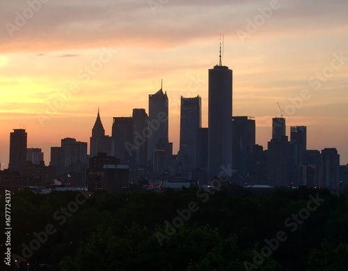 city, skyline, sunset, silhouette, building, skyscraper, urban, horizon, twilight, gold, light, dark, tree, foliage, landscape, view, panorama, city landscape, evening, dusk, dramatic, vibrant, colours, structure, modern, architecture, nature, background