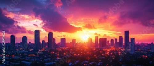 City skyline sunset, vibrant colors, urban landscape, evening light